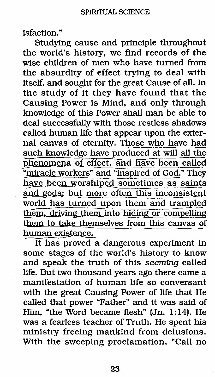 Studying cause and principle throughout the world's history, we find records of the wise children of men who have turned from the absurdity of effect trying to deal with itself, and sought for the great Cause of all. In the study of it they have found that the Causing Power is Mind, and only through knowledge of this Power shall man be able to deal successfully with those restless shadows called human life that appear upon the external canvas of eternity. Those who have had such knowledge have produced at will all the phenomena of effect, an-have been called "miracle workers" and "inspired of God." They have been worshiped sometimes as saints and gods; but more often this inconsistent world has turned upon them and trampled them into hiding or compelling them to take themselves from this canvas of human existence.