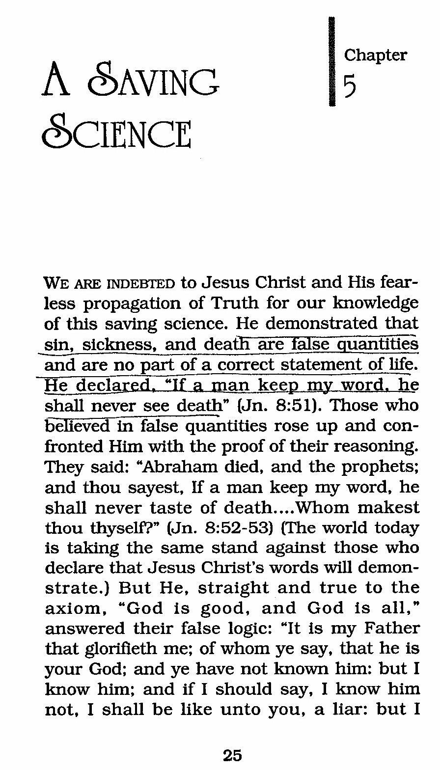 WE ARE INDEBTED to Jesus Christ and His fearless propagation of Truth for our knowledge of this saving science. He demonstrated that sin, sickness, and death are false quantities and are no part of a correct statement of life. He declared, "If a man keep my word. he shall never see death" (Jn. 8:51). Those who believed in false quantities rose up and confronted Him with the proof of their reasoning. They said: "Abraham died, and the prophets; and thou sayest, If a man keep my word, he shall never taste of death....Whom makest thou thyself?" (Jn. 8:52-53) (The world today is taking the same stand against those who declare that Jesus Christ's words will demonstrate.) But He, straight and true to the axiom, "God is good, and God is all," answered their false logic: "It is my Father that glorifieth me; of whom ye say, that he is your God; and ye have not known him: but I know him; and if I should say, I know him not, I shall be like unto you, a liar: but I