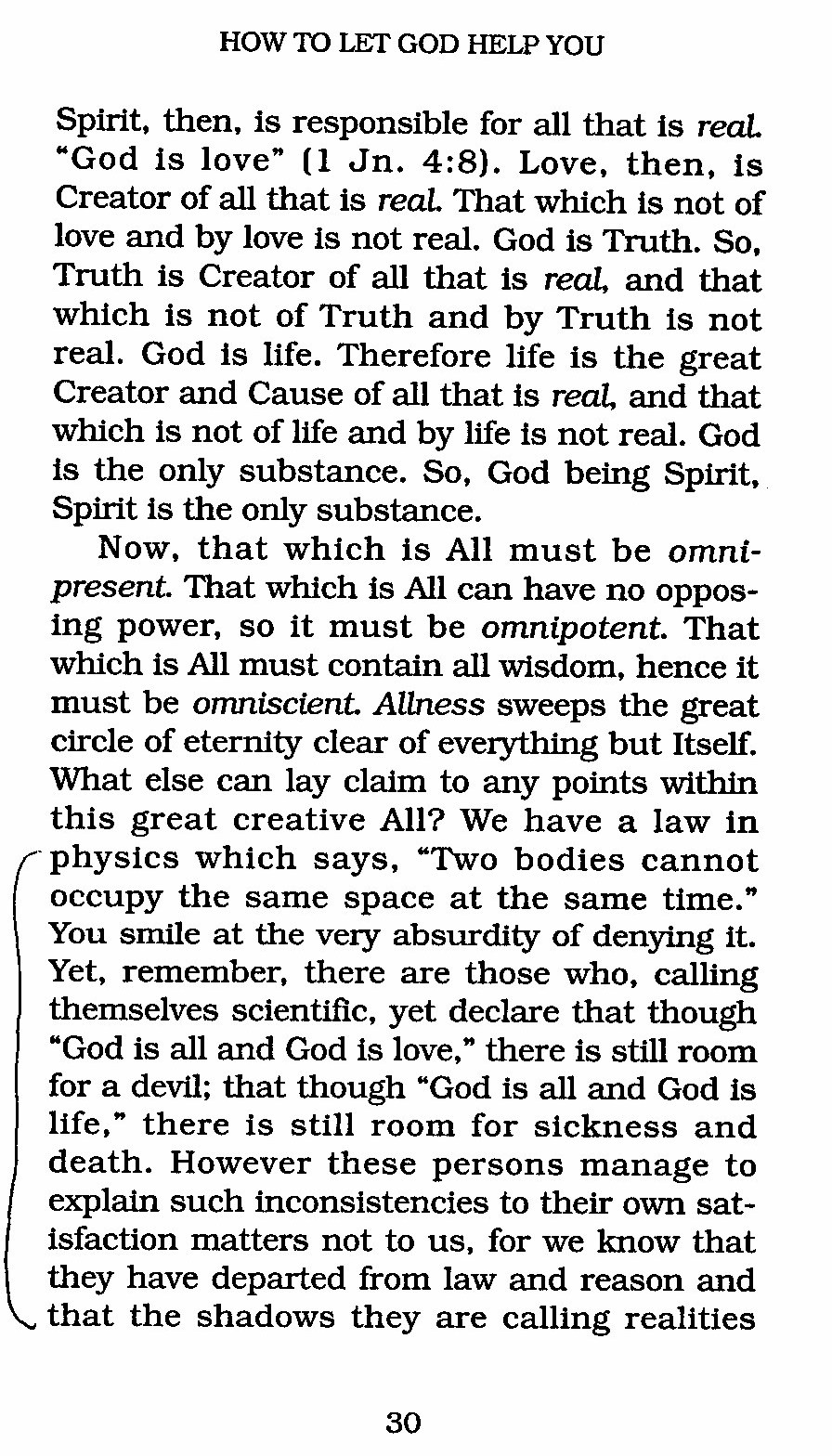 Now, that which is All must be omnipresent. That which is All can have no opposing power, so it must be omnipotent. That which is All must contain all wisdom, hence it must be omniscient. Allness sweeps the great circle of eternity clear of everything but Itself. What else can lay claim to any points within this great creative All? We have a law in physics which says, "Two bodies cannot occupy the same space at the same time." You smile at the very absurdity of denying it. Yet, remember, there are those who, calling themselves scientific, yet declare that though "God is all and God is love," there is still room for a devil; that though "God is all and God is life," there is still room for sickness and death. However these persons manage to explain such inconsistencies to their own satisfaction matters not to us, for we know that they have departed from law and reason and that the shadows they are calling realities
