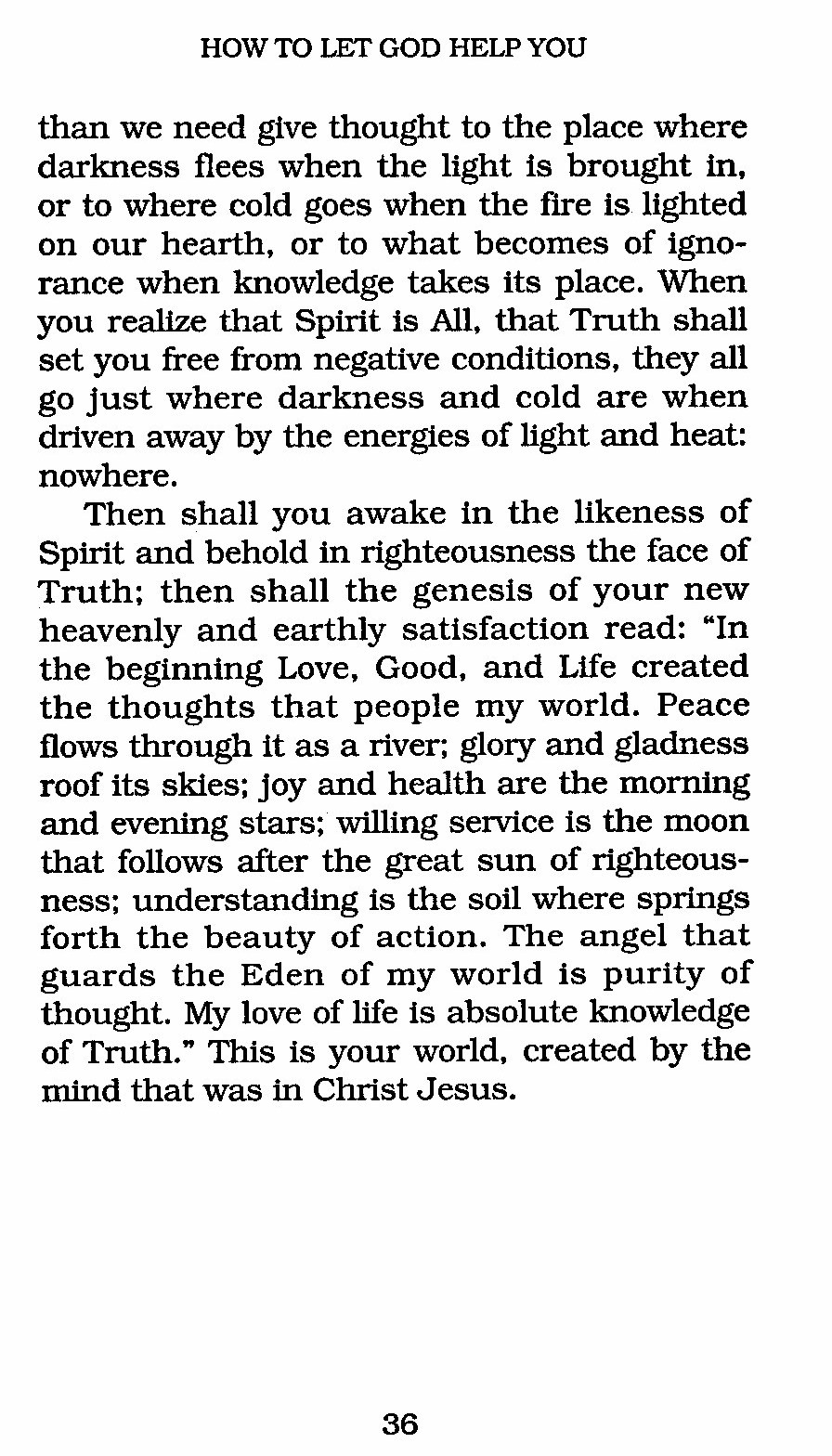 Then shall you awake in the likeness of Spirit and behold in righteousness the face of Truth; then shall the genesis of your new heavenly and earthly satisfaction read: "In the beginning Love, Good, and Life created the thoughts that people my world. Peace flows through it as a river; glory and gladness roof its skies; joy and health are the morning and evening stars; willing service is the moon that follows after the great sun of righteousness; understanding is the soil where springs forth the beauty of action. The angel that guards the Eden of my world is purity of thought. My love of life is absolute knowledge of Truth." This is your world, created by the mind that was in Christ Jesus.