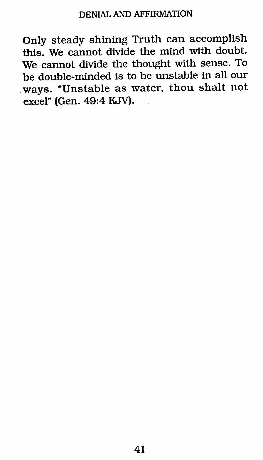 Only steady shining Truth can accomplish this. We cannot divide the mind with doubt. We cannot divide the thought with sense. To be double-minded is to be unstable in all our ways. "Unstable as water, thou shalt not excel" (Gen. 49:4 KJV).