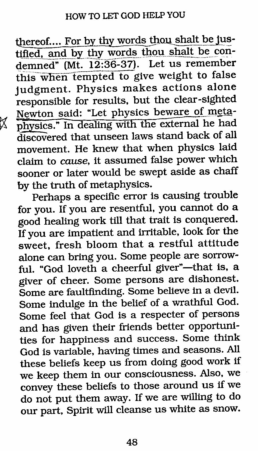 Perhaps a specific error is causing trouble for you. If you are resentful, you cannot do a good healing work till that trait is conquered. If you are impatient and irritable, look for the sweet, fresh bloom that a restful attitude alone can bring you. Some people are sorrowful. "God loveth a cheerful giver" --- that is, a giver of cheer. Some persons are dishonest. Some are faultfinding. Some believe in a devil. Some indulge in the belief of a wrathful God. Some feel that God is a respecter of persons and has given their friends better opportunities for happiness and success. Some think God is variable, having times and seasons. All these beliefs keep us from doing good work if we keep them in our consciousness. Also, we convey these beliefs to those around us if we do not put them away. If we are willing to do our part, Spirit will cleanse us white as snow.