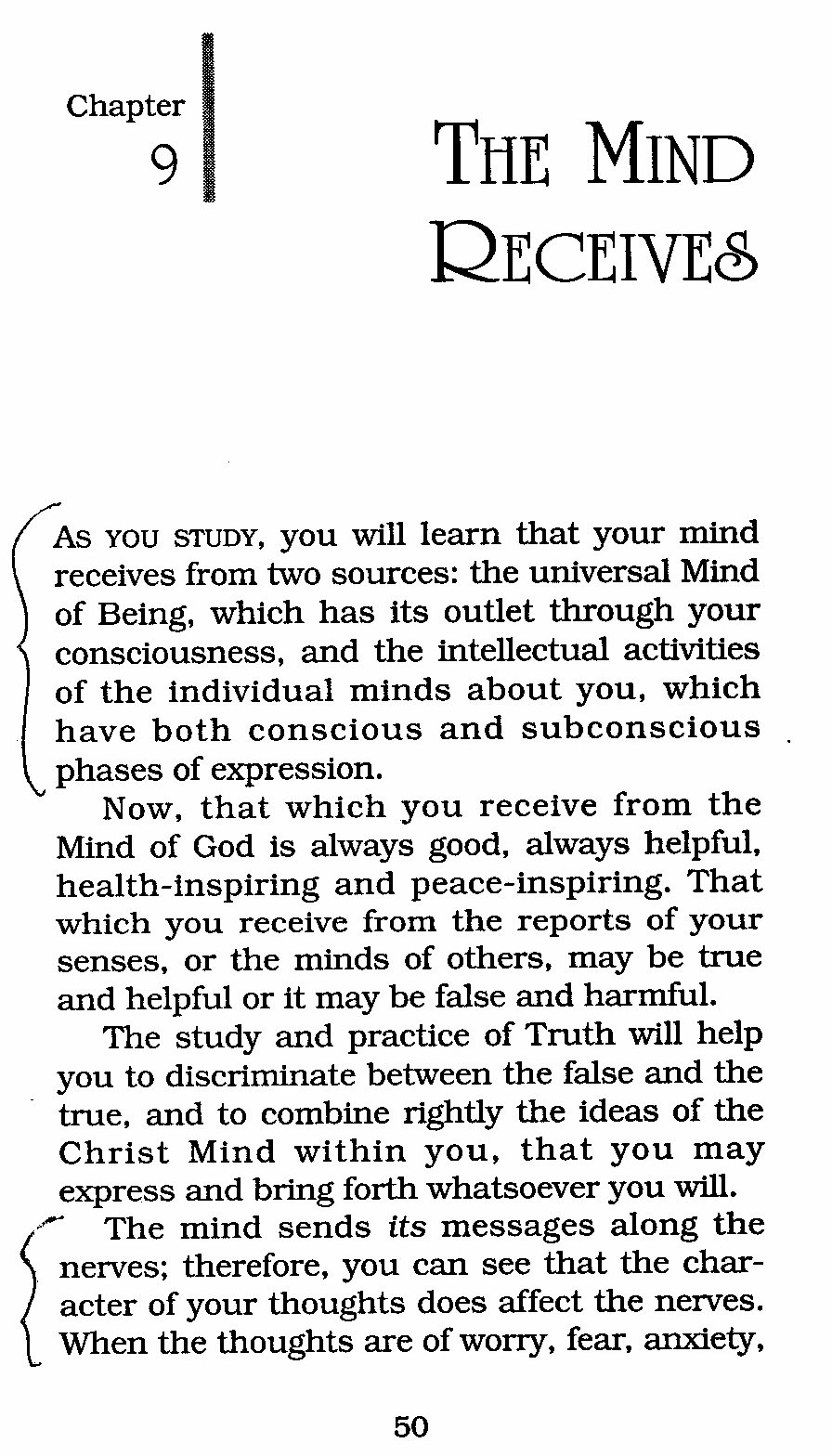 AS YOU STUDY, you will learn that your mind receives from two sources: the universal Mind of Being, which has its outlet through your consciousness, and the intellectual activities of the individual minds about you, which have both conscious and subconscious phases of expression.