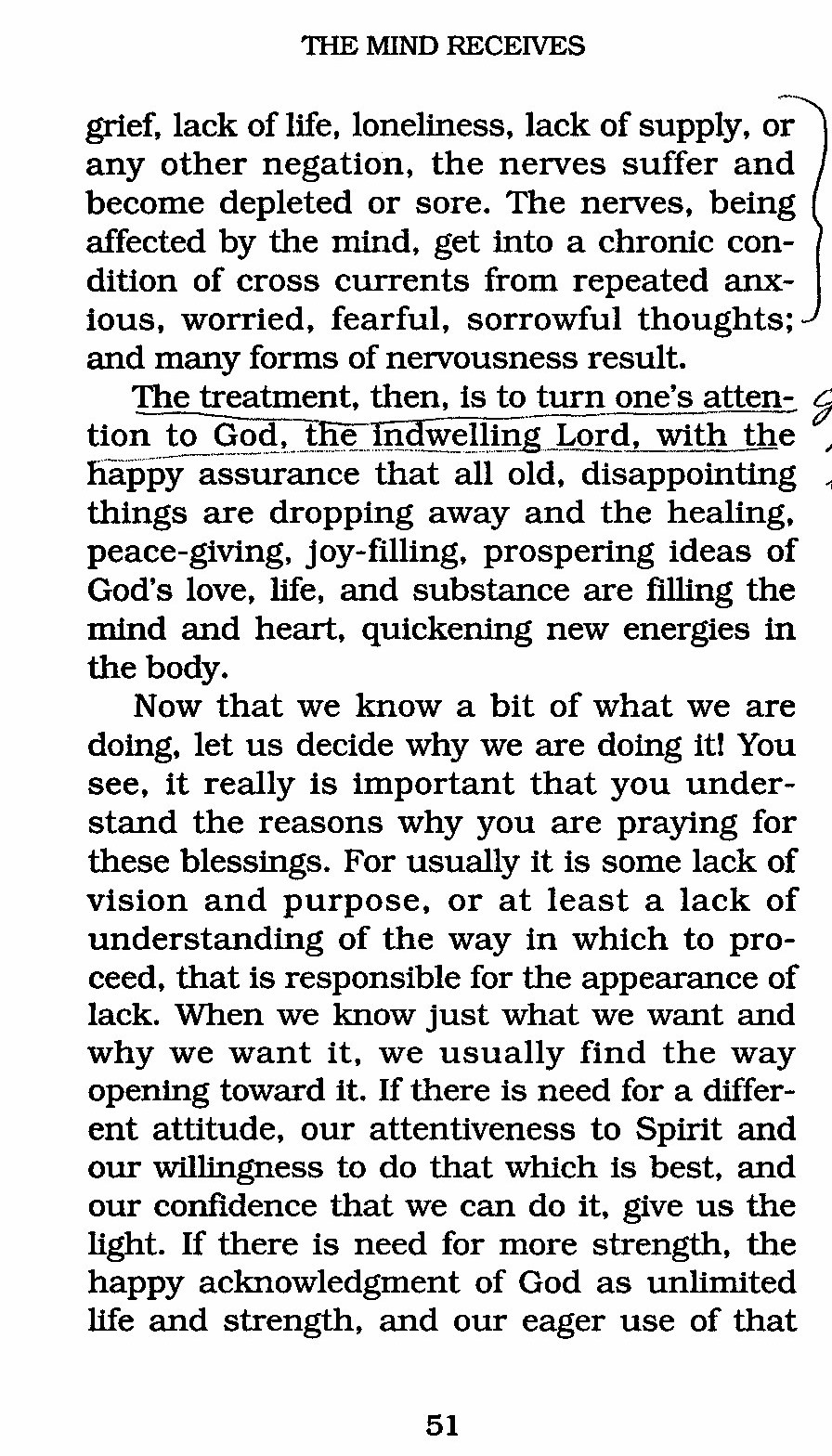 Now that we know a bit of what we are doing, let us decide why we are doing it! You see, it really is important that you understand the reasons why you are praying for these blessings. For usually it is some lack of vision and purpose, or at least a lack of understanding of the way in which to proceed, that is responsible for the appearance of lack. When we know just what we want and why we want it, we usually find the way opening toward it. If there is need for a different attitude, our attentiveness to Spirit and our willingness to do that which is best, and our confidence that we can do it, give us the light. If there is need for more strength, the happy acknowledgment of God as unlimited life and strength, and our eager use of that