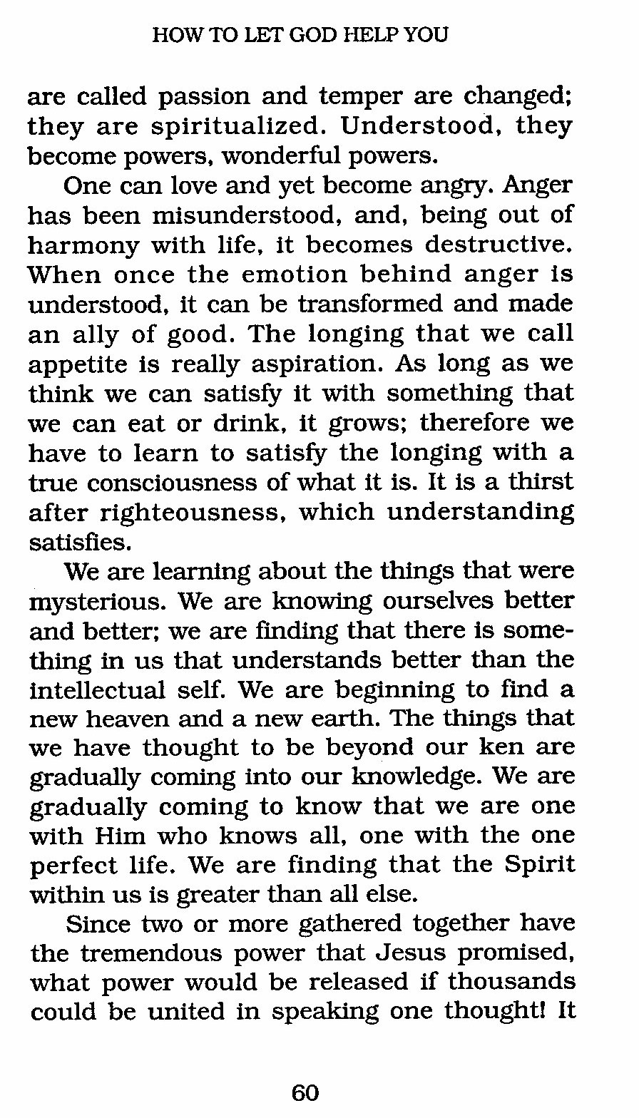 One can love and yet become angry. Anger has been misunderstood, and, being out of harmony with life, it becomes destructive. When once the emotion behind anger is understood, it can be transformed and made an ally of good. The longing that we call appetite is really aspiration. As long as we think we can satisfy it with something that we can eat or drink, it grows; therefore we have to learn to satisfy the longing with a true consciousness of what it is. It is a thirst after righteousness, which understanding satisfies.