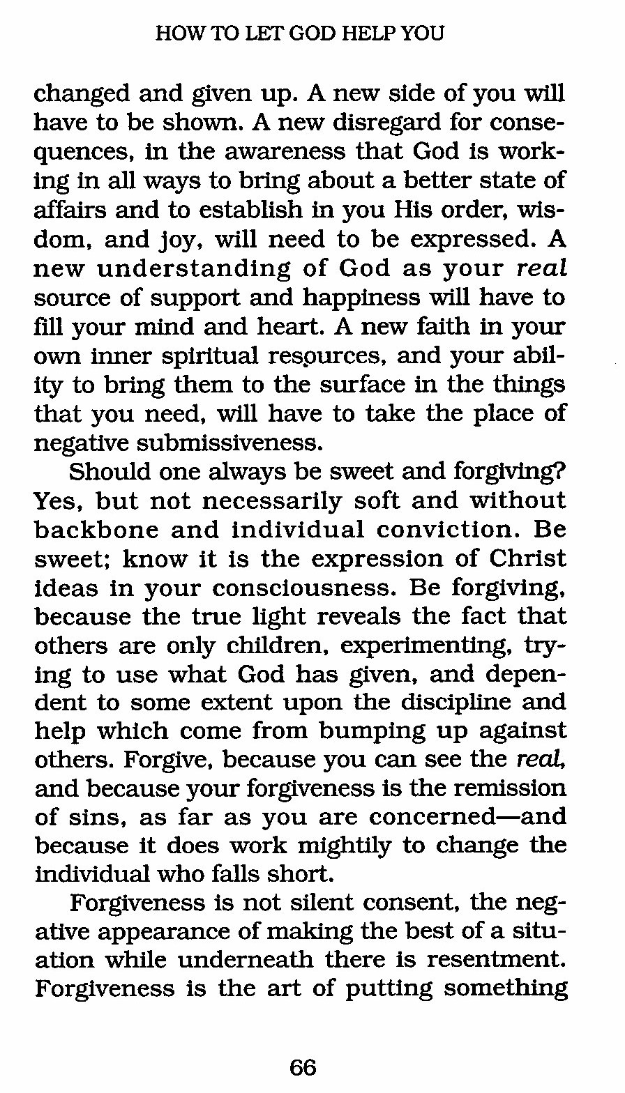 changed and given up. A new side of you will have to be shown. A new disregard for consequences, in the awareness that God is working in all ways to bring about a better state of affairs and to establish in you His order, wisdom, and joy, will need to be expressed. A new understanding of God as your real source of support and happiness will have to fill your mind and heart. A new faith in your own inner spiritual resources, and your ability to bring them to the surface in the things that you need, will have to take the place of negative submissiveness.