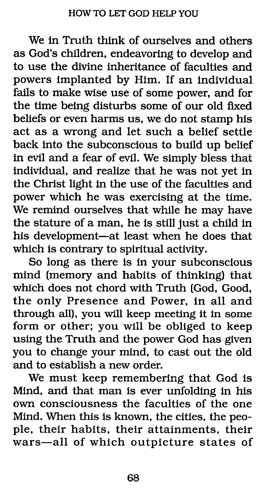We in Truth think of ourselves and others as God's children, endeavoring to develop and to use the divine inheritance of faculties and powers implanted by Him. If an individual fails to make wise use of some power, and for the time being disturbs some of our old fixed beliefs or even harms us, we do not stamp his act as a wrong and let such a belief settle back into the subconscious to build up belief in evil and a fear of evil. We simply bless that individual, and realize that he was not yet in the Christ light in the use of the faculties and power which he was exercising at the time. We remind ourselves that while he may have the stature of a man, he is still just a child in his development --- at least when he does that which is contrary to spiritual activity.