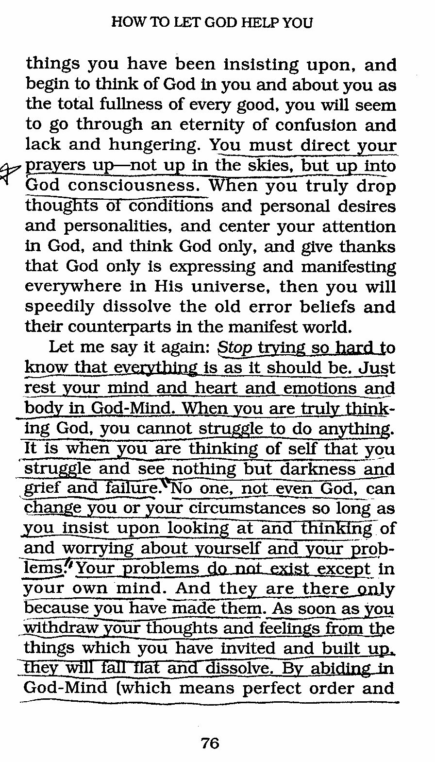 Let me say it again: Stop trying so hard to know that everything is as it should be. Just rest your mind and heart and emotions and body in God-Mind. When you are truly being God, you cannot struggle to do anything. It is when you are thinking of self that you struggle and see nothing but darkness and grief and failure. No one, not even God, can change you or your circumstances so long as you insist upon looking at and worrying about yourself and your problems. Your problems do not exist except in your own mind. And they are there only because you have made them. As soon as you withdraw your thoughts and feelings from the things which you have invited and built up, they will fall flat and dissolve. By abiding in God-Mind (which means perfect order and