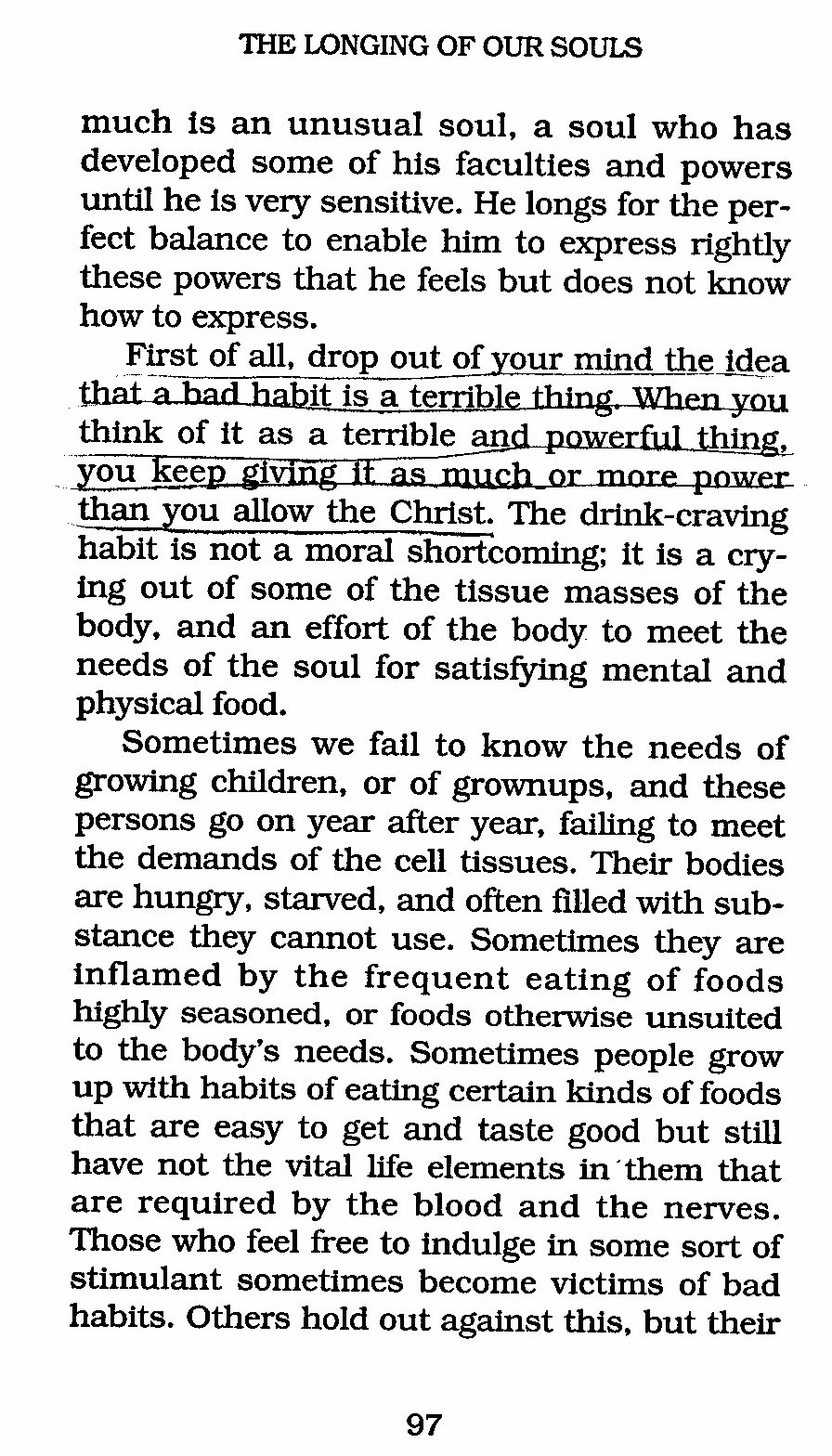 First of all, drop out of your mind the idea habit is terrible thing. When you think of it as a terrible and powerful thing, you keep giving it as much or more power than you allow the Christ. The drink-craving habit is not a moral shortcoming; it is a crying out of some of the tissue masses of the body, and an effort of the body to meet the needs of the soul for satisfying mental and physical food.