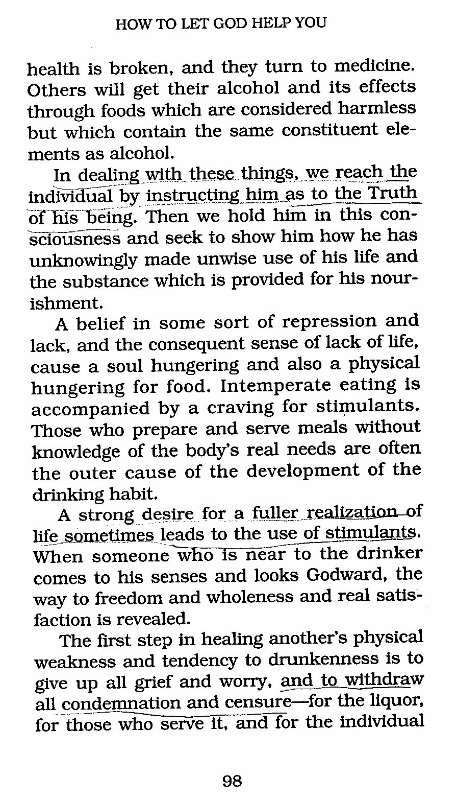 A strong desire for a fuller realization of life sometimes leads to the use of stimulants. When someone who is near to the drinker comes to his senses and looks Godward, the way to freedom and wholeness and real satisfaction is revealed.