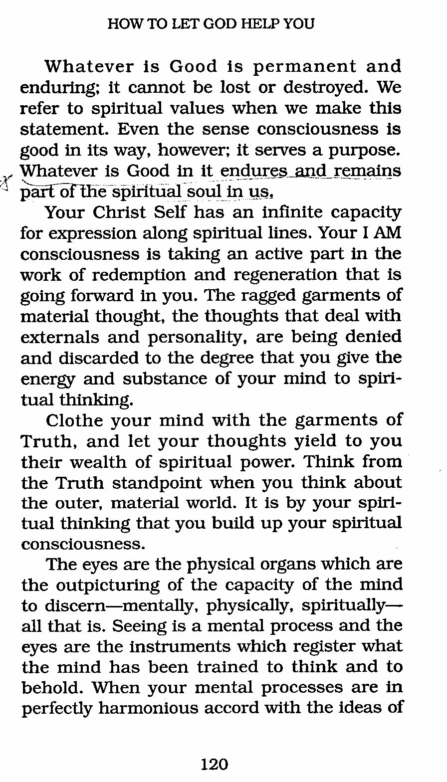 Your Christ Self has an infinite capacity for expression along spiritual lines. Your I AM consciousness is taking an active part in the work of redemption and regeneration that is going forward in you. The ragged garments of material thought, the thoughts that deal with externals and personality, are being denied and discarded to the degree that you give the energy and substance of your mind to spiritual thinking.