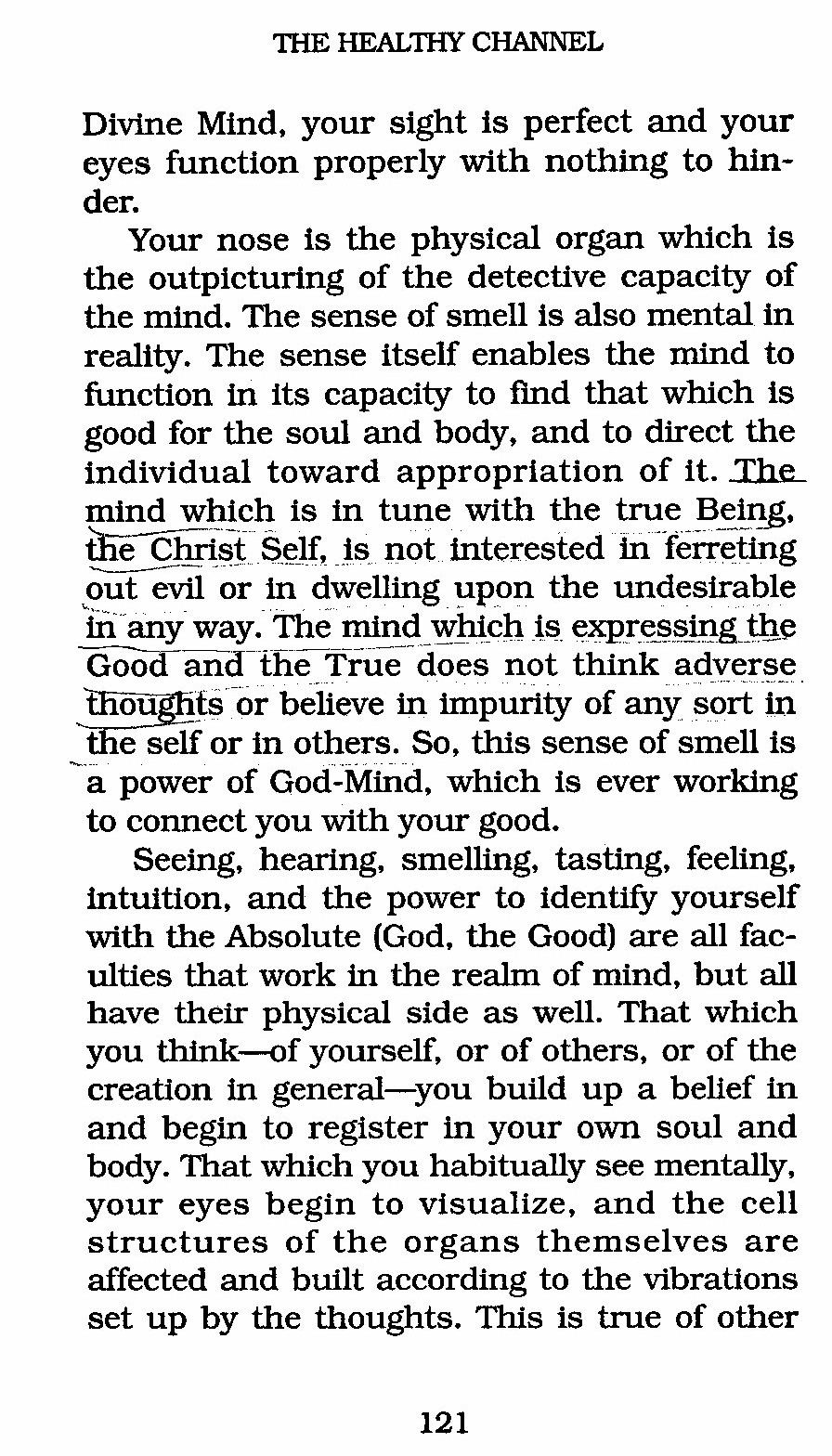Seeing, hearing, smelling, tasting, feeling, intuition, and the power to identify yourself with the Absolute (God, the Good) are all faculties that work in the realm of mind, but all have their physical side as well. That which you think --- of yourself, or of others, or of the creation in general --- you build up a belief in and begin to register in your own soul and body. That which you habitually see mentally, your eyes begin to visualize, and the cell structures of the organs themselves are affected and built according to the vibrations set up by the thoughts. This is true of other