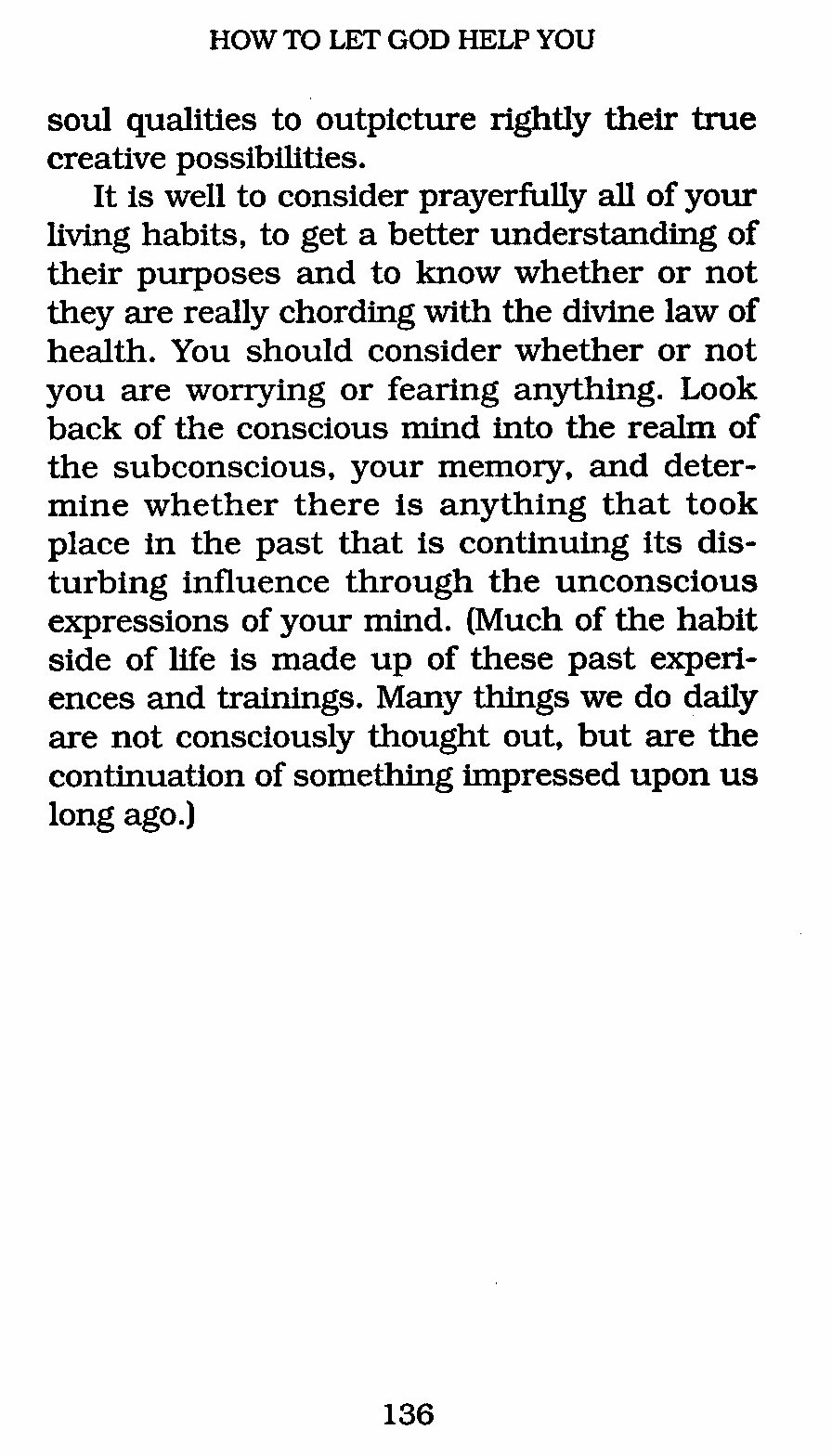 It is well to consider prayerfully all of your living habits, to get a better understanding of their purposes and to know whether or not they are really chording with the divine law of health. You should consider whether or not you are worrying or fearing anything. Look back of the conscious mind into the realm of the subconscious, your memory, and determine whether there is anything that took place in the past that is continuing its disturbing influence through the unconscious expressions of your mind. (Much of the habit side of life is made up of these past experiences and trainings. Many things we do daily are not consciously thought out, but are the continuation of something impressed upon us long ago.)