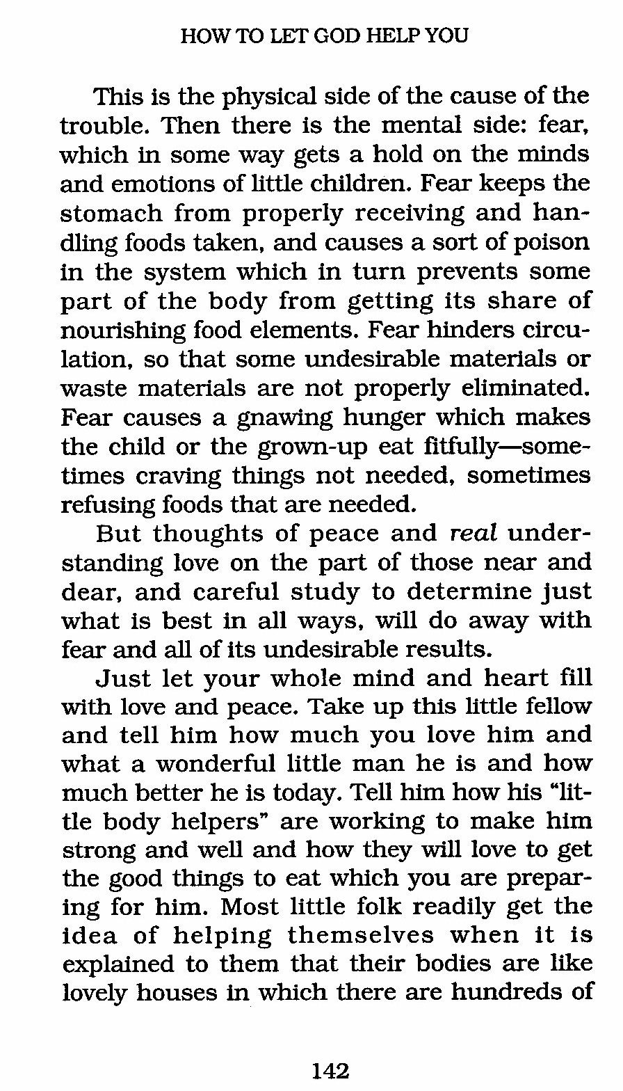 Just let your whole mind and heart fill with love and peace. Take up this little fellow and tell him how much you love him and what a wonderful little man he is and how much better he is today. Tell him how his "little body helpers" are working to make him strong and well and how they will love to get the good things to eat which you are preparing for him. Most little folk readily get the idea of helping themselves when it is explained to them that their bodies are like lovely houses in which there are hundreds of