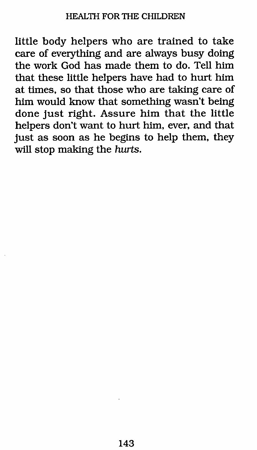 little body helpers who are trained to take care of everything and are always busy doing the work God has made them to do. Tell him that these little helpers have had to hurt him at times, so that those who are taking care of him would know that something wasn't being done just right. Assure him that the little helpers don't want to hurt him, ever, and that just as soon as he begins to help them, they will stop making the hurts.