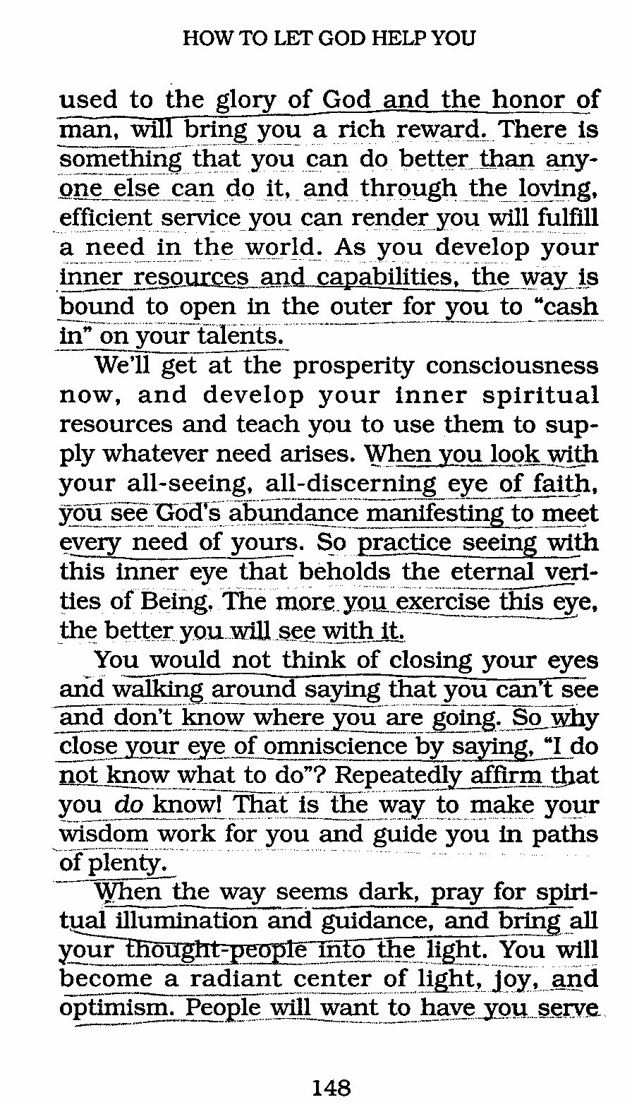 We'll get at the prosperity consciousness now, and develop your inner spiritual resources and teach you to use them to supply whatever need arises. When you look with your all-seeing, all-discerning eye of faith, you see God's abundance manifesting to meet every need of yours. So practice seeing with this inner eye that beholds the eternal verities of Being. The more you exercise this eye, the better you will see with it.