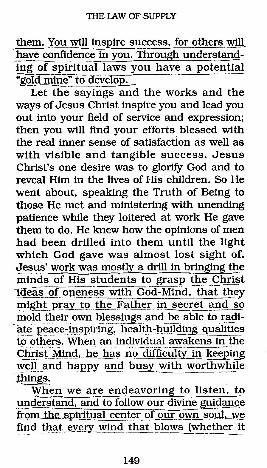Let the sayings and the works and the ways of Jesus Christ inspire you and lead you out into your field of service and expression; then you will find your efforts blessed with the real inner sense of satisfaction as well as with visible and tangible success. Jesus Christ's one desire was to glorify God and to reveal Him in the lives of His children. So He went about, speaking the Truth of Being to those He met and ministering with unending patience while they loitered at work He gave them to do. He knew how the opinions of men had been drilled into them until the light which God gave was almost lost sight of. Jesus' work was mostly a drill in bringing the minds of His students to grasp the Christ Ideas of oneness with God-Mind, that they might pray to the Father in secret and so mold their own blessings and be able to radiate peace inspiring, health-building qualities to others. When an individual awakens in the Christ Mind he has no difficulty in keeping well and happy and busy with worthwhile things.