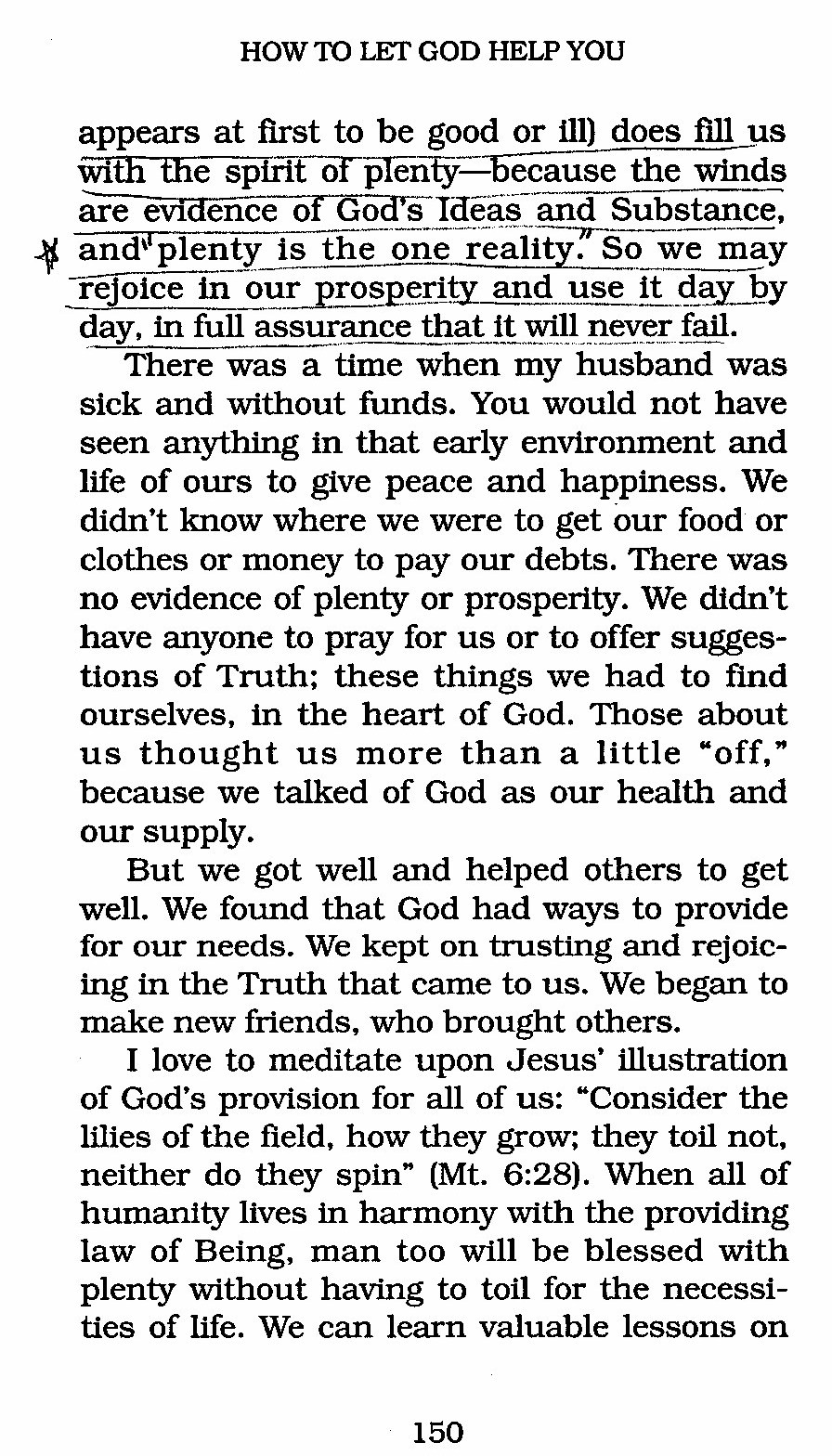There was a time when my husband was sick and without funds. You would not have seen anything in that early environment and life of ours to give peace and happiness. We didn't know where we were to get our food or clothes or money to pay our debts. There was no evidence of plenty or prosperity. We didn't have anyone to pray for us or to offer suggestions of Truth; these things we had to find ourselves, in the heart of God. Those about us thought us more than a little "off," because we talked of God as our health and our supply.