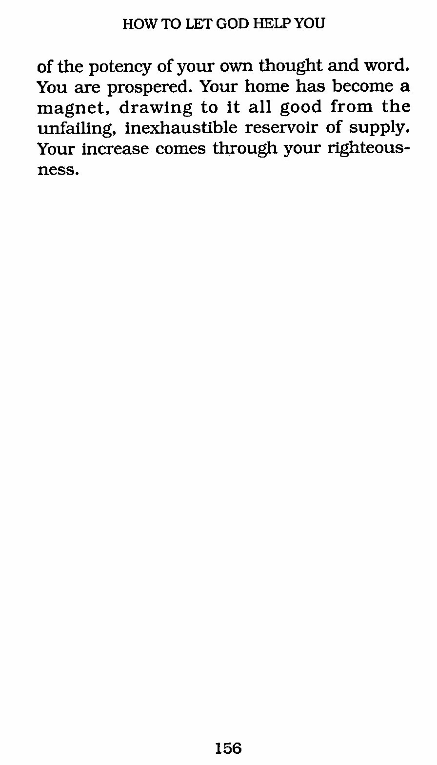 of the potency of your own thought and word. You are prospered. Your home has become a magnet, drawing to it all good from the unfailing, inexhaustible reservoir of supply. Your increase comes through your righteousness.