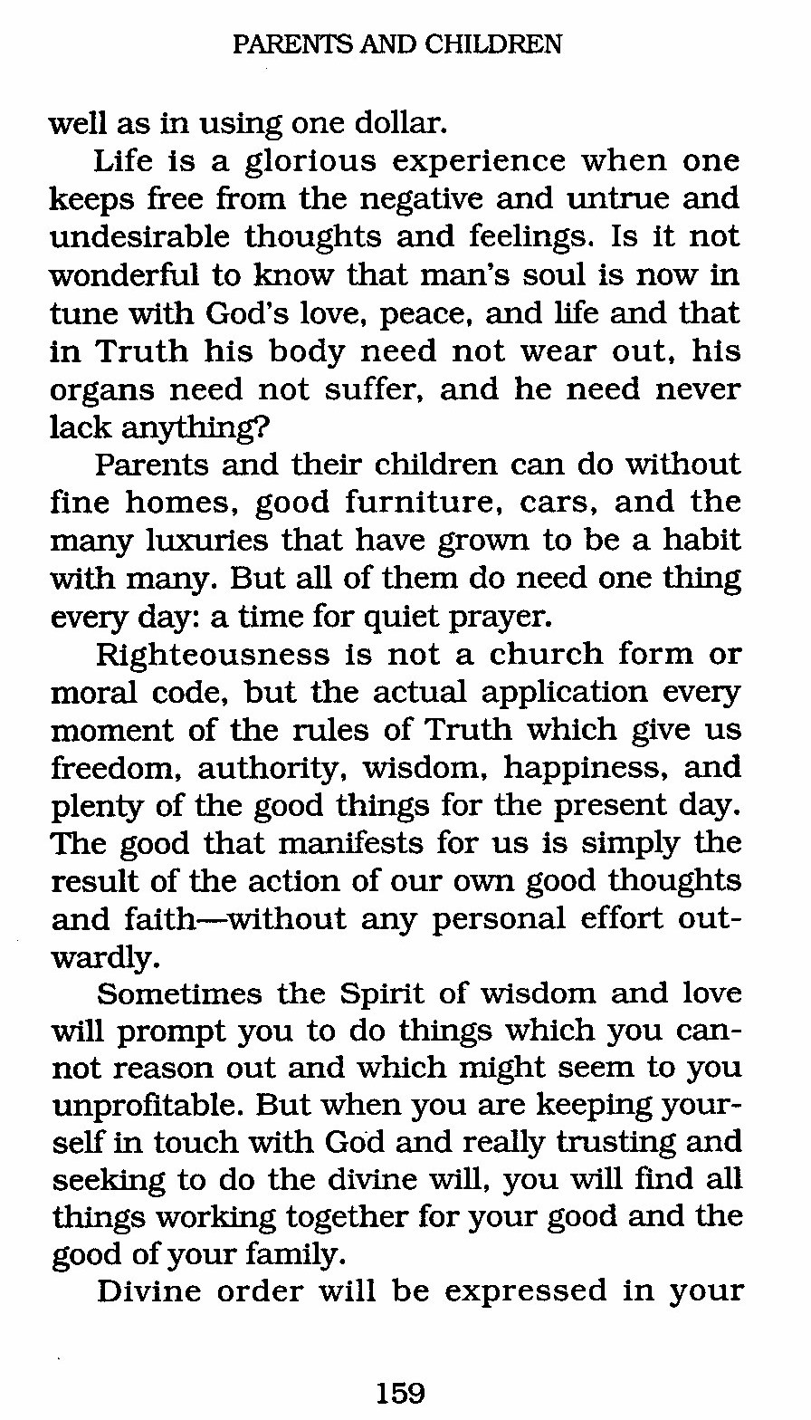 Righteousness is not a church form or moral code, but the actual application every moment of the rules of Truth which give us freedom, authority, wisdom, happiness, and plenty of the good things for the present day. The good that manifests for us is simply the result of the action of our own good thoughts and faith --- without any personal effort outwardly.