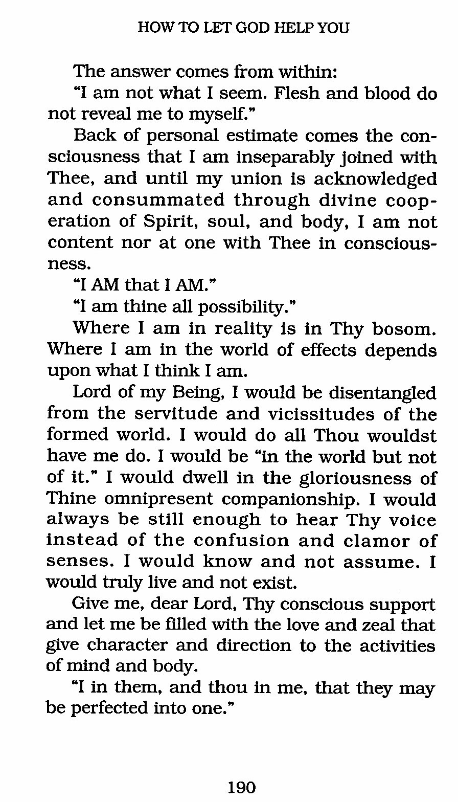Lord of my Being, I would be disentangled from the servitude and vicissitudes of the formed world. I would do all Thou wouldst have me do. I would be "in the world but not of it." I would dwell in the gloriousness of Thine omnipresent companionship. I would always be still enough to hear Thy voice instead of the confusion and clamor of senses. I would know and not assume. I would truly live and not exist.