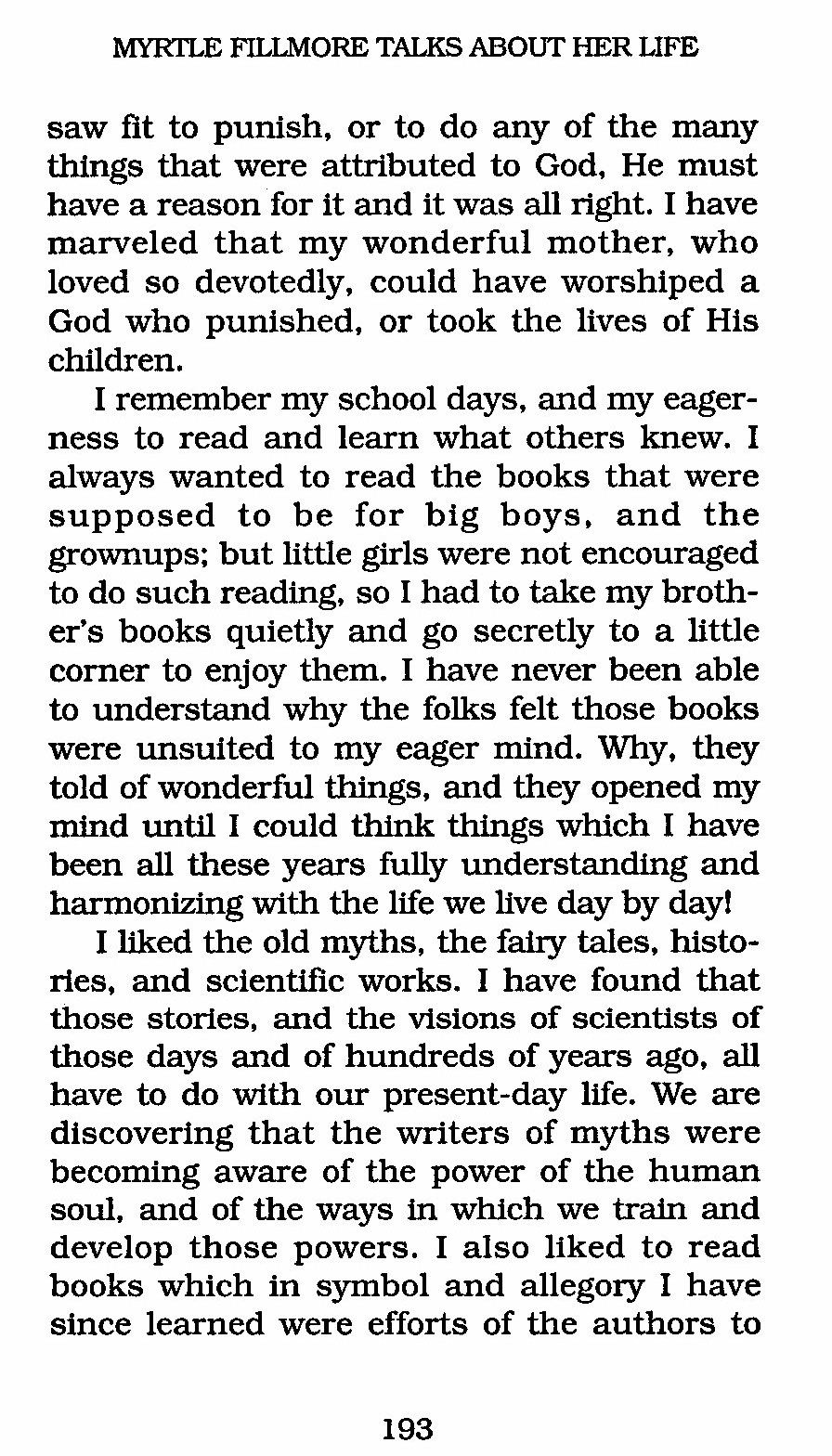 I liked the old myths, the fairy tales, histories, and scientific works. I have found that those stories, and the visions of scientists of those days and of hundreds of years ago, all have to do with our present-day life. We are discovering that the writers of myths were becoming aware of the power of the human soul, and of the ways in which we train and develop those powers. I also liked to read books which in symbol and allegory I have since learned were efforts of the authors to