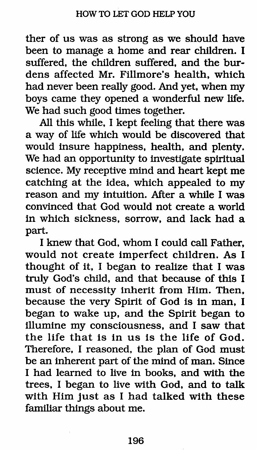 I knew that God, whom I could call Father, would not create imperfect children. As I thought of it, I began to realize that I was truly God's child, and that because of this I must of necessity inherit from Him. Then, because the very Spirit of God is in man, I began to wake up, and the Spirit began to illumine my consciousness, and I saw that the life that is in us is the life of God. Therefore, I reasoned, the plan of God must be an inherent part of the mind of man. Since I had learned to live in books, and with the trees, I began to live with God, and to talk with Him Just as I had talked with these familiar things about me.