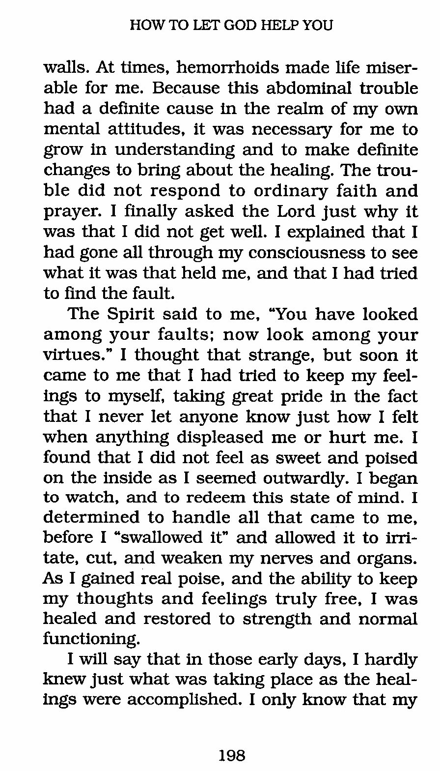The Spirit said to me, "You have looked among your faults; now look among your virtues." I thought that strange, but soon it came to me that I had tried to keep my feelings to myself, taking great pride in the fact that I never let anyone know just how I felt when anything displeased me or hurt me. I found that I did not feel as sweet and poised on the inside as I seemed outwardly. I began to watch, and to redeem this state of mind. I determined to handle all that came to me, before I "swallowed it" and allowed it to irritate, cut, and weaken my nerves and organs. As I gained real poise, and the ability to keep my thoughts and feelings truly free, I was healed and restored to strength and normal functioning.