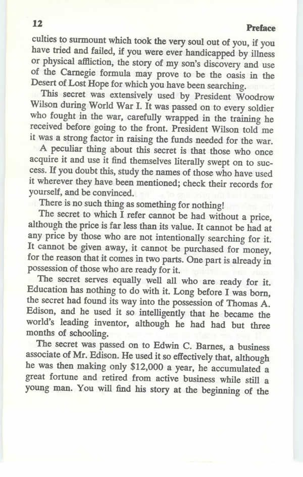 The secret was passed on to a business associate of Mr. Edison. He used it so effectively that, although he was then making only $12,000 a year, he accumulated a great fortune, and retired from active business while still a young man. You will find his story at the beginning of the first chapter. It should convince you that riches are not beyond your reach, that you can still be what you wish to be, that money, fame, recognition and happiness can be had by all who are ready and determined to have these blessings.