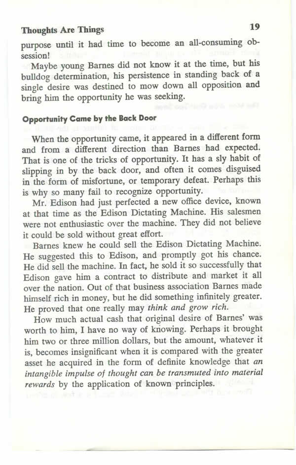 How much actual cash that original DESIRE of Barnes' has been worth to him, I have no way of knowing. Perhaps it has brought him two or three million dollars, but the amount, whatever it is, becomes insignificant when compared with the greater asset he acquired in the form of definite knowledge that an intangible impulse of thought can be transmuted into its physical counterpart by the application of known principles.