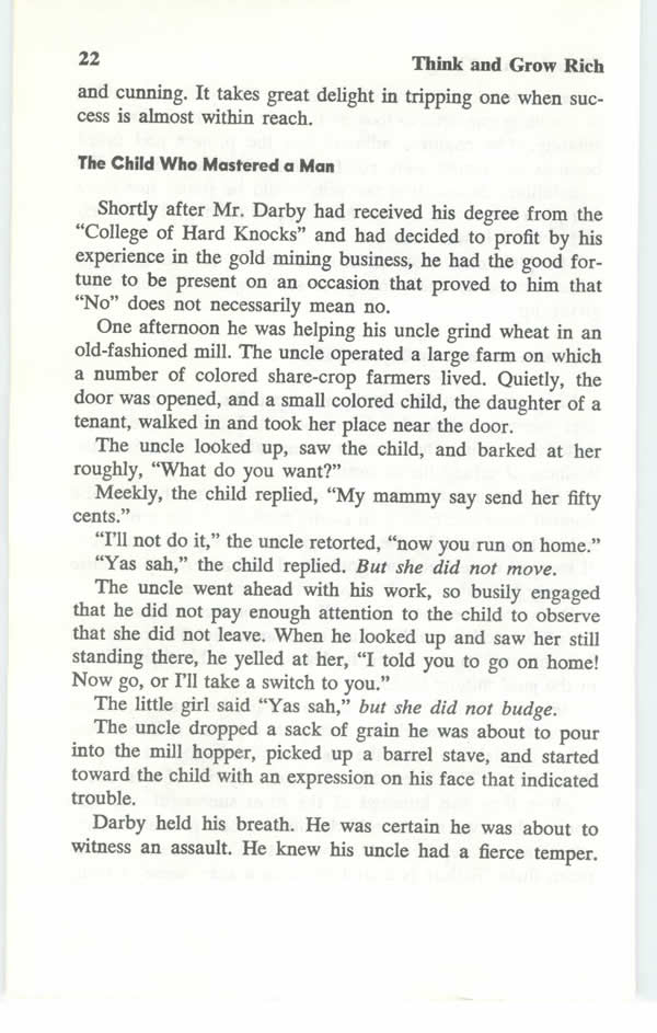 A FIFTY-CENT LESSON IN PERSISTENCEShortly after Mr. Darby received his degree from the "University of Hard Knocks," and had decided to profit by his experience in the gold mining business, he had the good fortune to be present on an occasion that proved to him that "No" does not necessarily mean no.