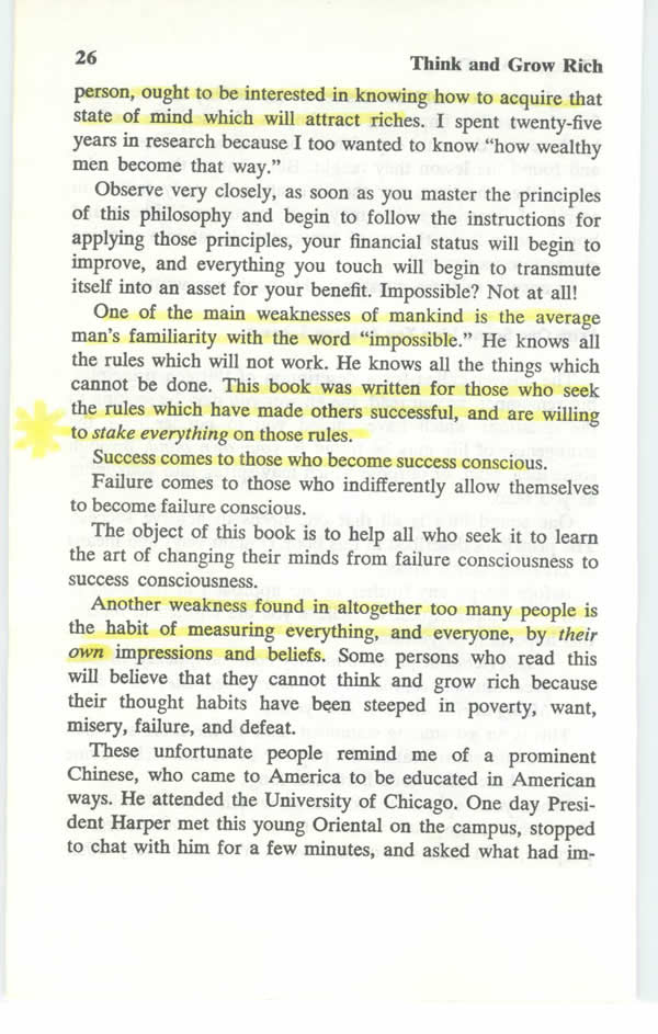 Another weakness found in altogether too many people, is the habit of measuring everything, and everyone, by their own impressions and beliefs. Some who will read this, will believe that no one can THINK AND GROW RICH. They cannot think in terms of riches, because their thought habits have been steeped in poverty, want, misery, failure, and defeat.