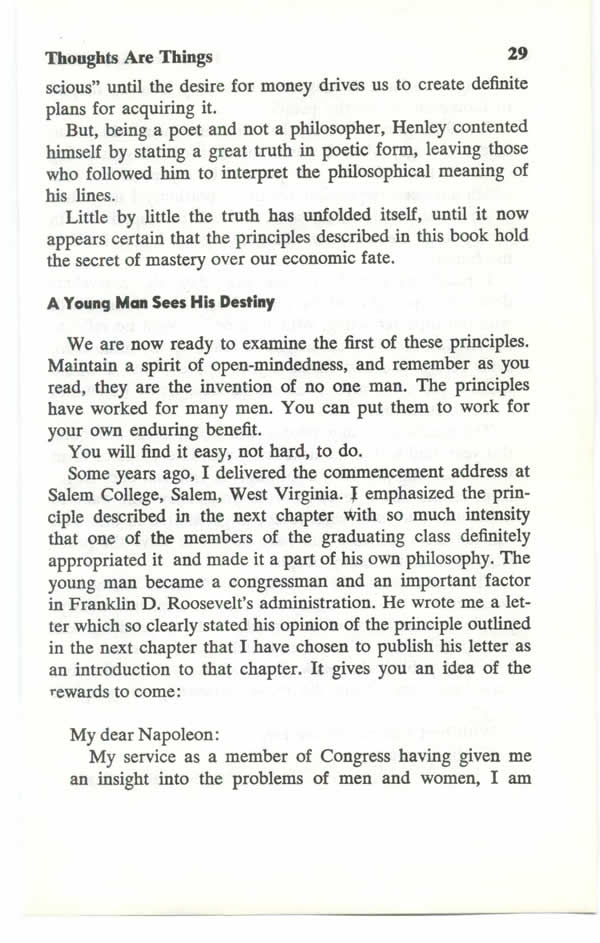 Almost fifteen years ago, I delivered the Commencement Address at Salem College, Salem, West Virginia. I emphasized the principle described in the next chapter, with so much intensity that one of the members of the graduating class definitely appropriated it, and made it a part of his own philosophy. The young man is now a Member of Congress, and an important factor in the present administration. Just before this book went to the publisher, he wrote me a letter in which he so clearly stated his opinion of the principle outlined in the next chapter, that I have chosen to publish his letter as an introduction to that chapter.