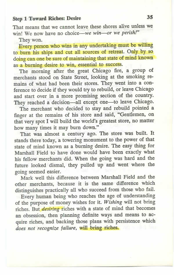 Every person who wins in any undertaking must be willing to burn his ships and cut all sources of retreat. Only by so doing can one be sure of maintaining that state of mind known as a BURNING DESIRE TO WIN, essential to success.