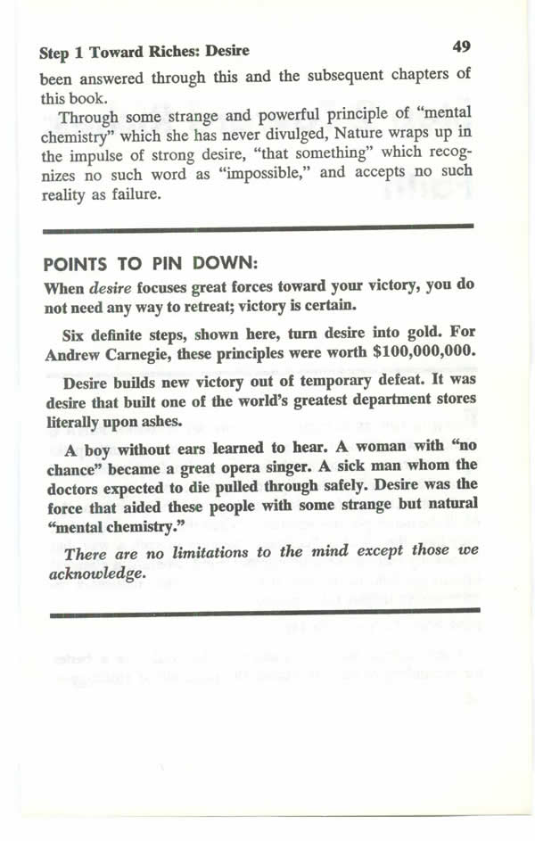 In all my experience in dealing with men and women who had personal problems, I never handled a single case which more definitely demonstrates the power of DESIRE. Authors sometimes make the mistake of writing of subjects of which they have but superficial, or very elementary knowledge. It has been my good fortune to have had the privilege of testing the soundness of the POWER OF DESIRE, through the affliction of my own son. Perhaps it was providential that the experience came as it did, for surely no one is better prepared than he, to serve as an example of what happens when DESIRE is put to the test. If Mother Nature bends to the will of desire, is it logical that mere men can defeat a burning desire?