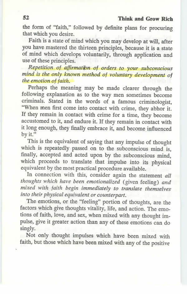 Repetition of affirmation of orders to your subconscious mind is the only known method of voluntary development of the emotion of faith.