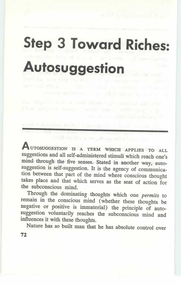 Remember, as you carry out these instructions, that you are applying the principle of auto-suggestion, for the purpose of giving orders to your subconscious mind. Remember, also, that your subconscious mind will act ONLY upon instructions which are emotionalized, and handed over to it with "feeling." FAITH is the strongest, and most productive of the emotions. Follow the instructions given in the chapter on FAITH.These instructions may, at first, seem abstract. Do not let this disturb you. Follow the instructions, no matter how abstract or impractical they may, at first, appear to be. The time will soon come, if you do as you have been instructed, in spirit as well as in act, when a whole new universe of power will unfold to you.