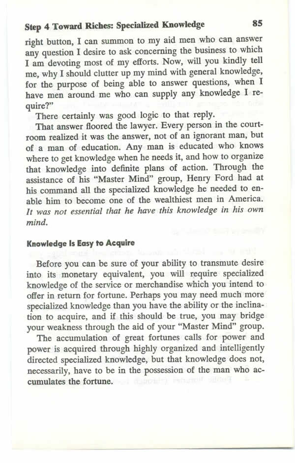 Contents - What Do You Want Most? - Tributes From Great American Leaders - Publisher's Preface - Author's Preface - Introduction - Desire - Faith - Auto-Suggestion - Specialized Knowledge - Imagination - Organized Planning - Decision - Persistence - Power of The Master Mind - The Mystery of Sex Transmutation - Subconscious Mind - Brain - Sixth Sense - How To Outwit The Six Ghosts of Fear