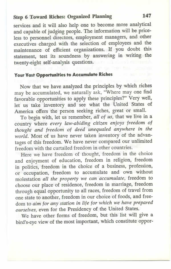 Contents - What Do You Want Most? - Tributes From Great American Leaders - Publisher's Preface - Author's Preface - Introduction - Desire - Faith - Auto-Suggestion - Specialized Knowledge - Imagination - Organized Planning - Decision - Persistence - Power of The Master Mind - The Mystery of Sex Transmutation - Subconscious Mind - Brain - Sixth Sense - How To Outwit The Six Ghosts of Fear