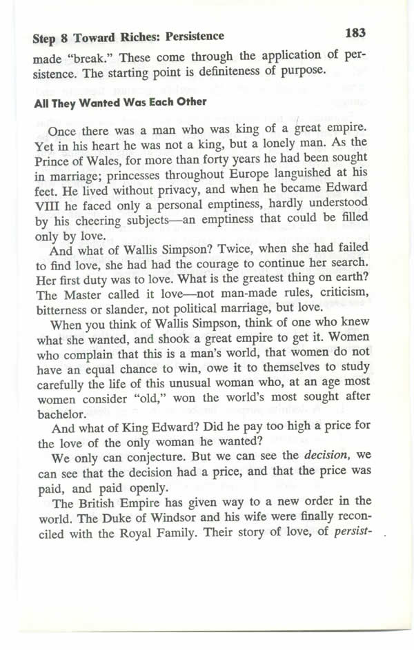 If good taste would permit, we might easily mention scores of men, well known to the American people, who climbed to great heights of achievement under the stimulating influence of their wives, only to drop back to destruction AFTER money and power went to their heads, and they put aside the old wife for a new one. Napoleon was not the only man to discover that sex influence, from the right source, is more powerful than any substitute of expediency, which may be created by mere reason.