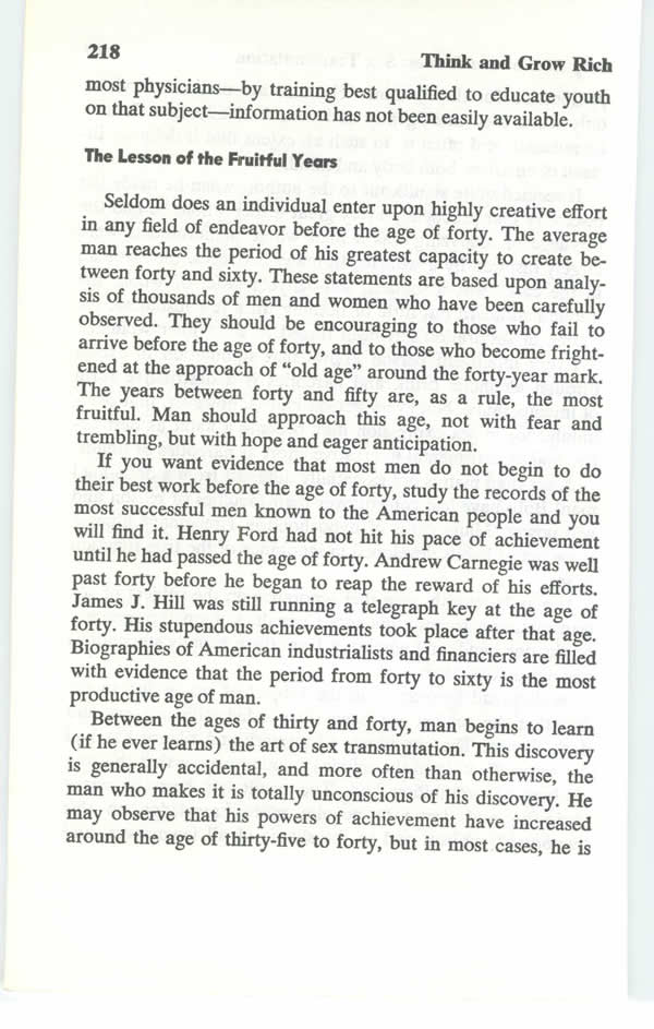 The sixth sense is not something that one can take off and put on at will. Ability to use this great power comes slowly, through application of the other principles outlined in this book. Seldom does any individual come into workable knowledge of the sixth sense before the age of forty. More often the knowledge is not available until one is well past fifty, and this, for the reason that the spiritual forces, with which the sixth sense is so closely related, do not mature and become usable except through years of meditation, self-examination, and serious thought.