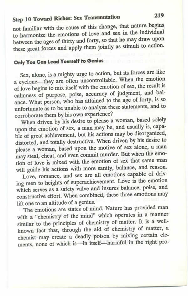 The chapter on the sixth sense was included, because the book is designed for the purpose of presenting a complete philosophy by which individuals may unerringly guide themselves in attaining whatever they ask of life. The starting point of all achievement is DESIRE. The finishing point is that brand of KNOWLEDGE which leads to understanding --- understanding of self, understanding of others, understanding of the laws of Nature, recognition and understanding of HAPPINESS.