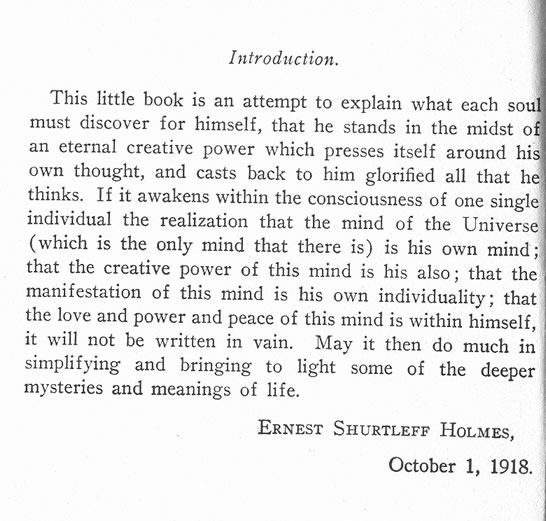 This little book is an attempt to explain what each soul must discover for himself, that he stands in the midst o an eternal creative power which presses itself around hi own thought, and casts back to him glorified all that he thinks. If it awakens within the consciousness of one single individual the realization that the mind of the Universel (which is the only mind that there is) is his own mind that the creative power of this mind is his also; that the manifestation of this mind is his own individuality; that the love and power and peace of this mind is within himself, it will not be written in vain. May it then do much in simplifying and bringing to light some of the deeper mysteries and meanings of life.
