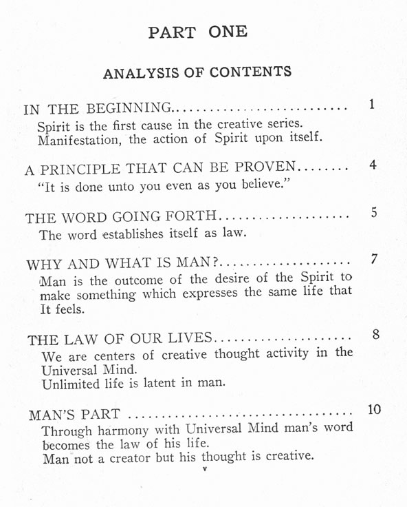 Contents - In the Beginning - A Princi[ple That Can Be Proven - The Word Going Forth - Why and What is Man? - The Law of Our Lives - Man's Part - Bondage and Freedom - The Word - The Man Who Has Arrived - The Power Within - Individual Ideas - The Reason for the Universe - Mind In Action - Action and Reaction - Arriving at a High Consciousness - Outer Suggestions - Use of the Greater Consciousness - The Greater Consciousness - Perfect Universe - About Struggle Karma - Practice -