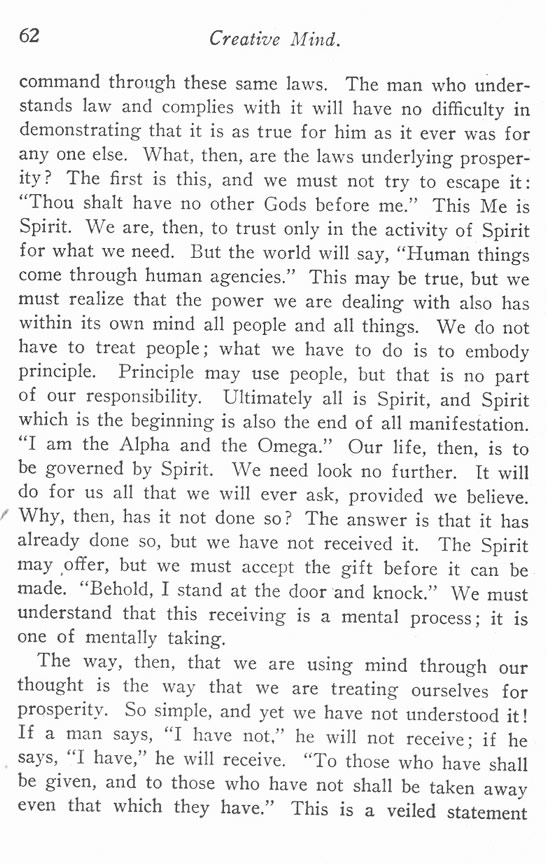 "Thou shalt have no other Gods before me." This Me is Spirit. We are, then, to trust only in the activity of Spirit for what we need. But the world will say, "Human things come through human agencies." This may be true, but we must realize that the power we are dealing with also has within its own mind all people and all things. We do not have to treat people; what we have to do is to embody principle. Principle may use people, but that is no part of our responsibility. Ultimately all is Spirit, and Spirit which is the beginning is also the end of all manifestation. "I am the Alpha and the Omega." Our life, then, is to be governed by Spirit. We need look no further. It will do for us all that we will ever ask, provided we believe.