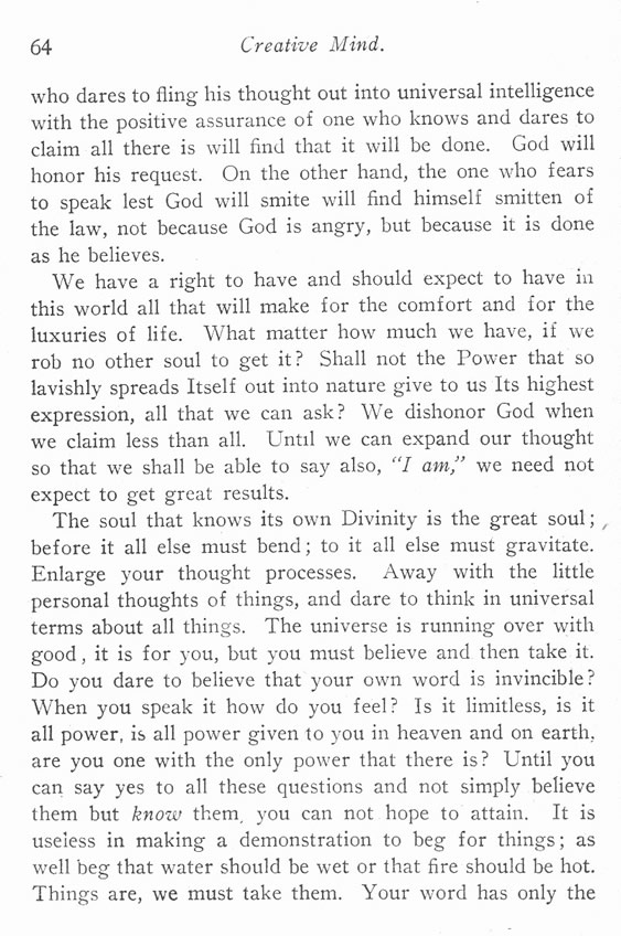 The soul that knows its own Divinity is the great soul; before it all else must bend; to it all else must gravitate. Enlarge your thought processes. Away with the little personal thoughts of things, and dare to think in universal terms about all things. The universe is running over with good, it is for you, but you must believe and then take it. Do you dare to believe that your own word is invincible? When you speak it how do you feel? Is it limitless, is it all power, is all power given to YOU in heaven and on earth, are you one with the only power that there is? Until you can say yes to all these questions and not simply believe them but know them, you can not hope to attain. It is useless in making a demonstration to beg for things; as well beg that water should be wet or that fire should be hot. Things are, we must take them. Your word has only the