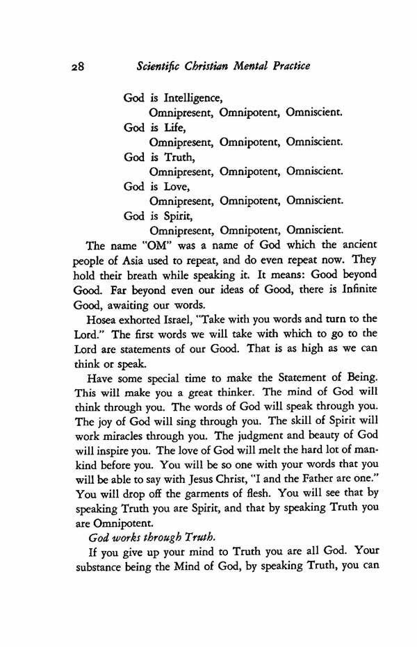 Have some special time to make the Statement of Being. This will make you a great thinker. The mind of God will think through you. The words of God will speak through you. The joy of God will sing through you. The skill of Spirit will work miracles through you. The judgment and beauty of God will inspire you. The love of God will melt the hard lot of mankind before you. You will be so one with your words that you will be able to say with Jesus Christ, "I and the Father are one." You will drop off the garments of flesh. You will see that by speaking Truth you are Spirit, and that by speaking Truth you are Omnipotent.