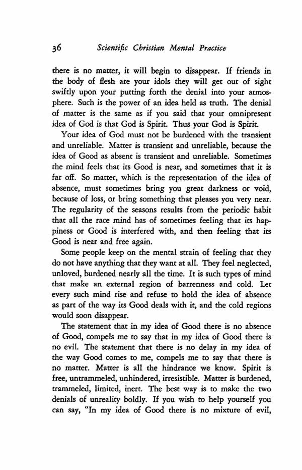 The statement that in my idea of Good there is no absence of Good, compels me to say that in my idea of Good there is no evil. The statement that there is no delay in my idea of the way Good comes to me, compels me to say that there is no matter. Matter is all the hindrance we know. Spirit is free, untrammeled, unhindered, irresistible. Matter is burdened, trammeled, limited, inert. The best way is to make the two denials of unreality boldly. If you wish to help yourself you can say, In my idea of Good there is no mixture of evil,