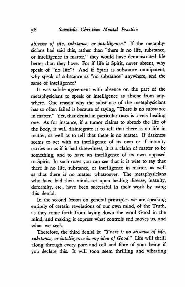 It was subtle agreement with absence on the part of the metaphysicians to speak of intelligence as absent from anywhere. One reason why the substance of the metaphysicians has so often failed is because of saying, "There is no substance in matter." Yet, that denial in particular cases is a very healing one. As for instance, if a tumor claims to absorb the life of the body, it will disintegrate it to tell that there is no life in matter, as well as to tell that there is no matter. If darkness seems to act with an intelligence of its own or if insanity carries on as if it had shrewdness, it is a claim of matter to be something, and to have an intelligence of its own opposed to Spirit. In such cases you can see that it is wise to say that there is no life, substance, or intelligence in matter, as well as that there is no matter whatsoever. The metaphysicians who have had their minds set upon healing disease, insanity, deformity, etc., have been successful in their work by using this denial.