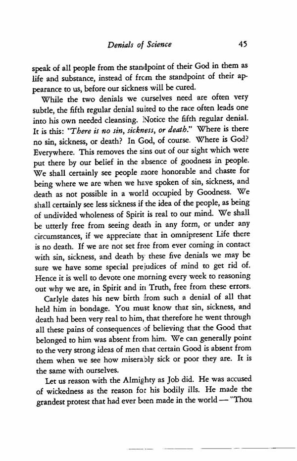 While the two denials we ourselves need are often very subtle, the fifth regular denial suited to the race often leads one into his own needed cleansing. Notice the fifth regular denial. It is this: "There is no sin, sickness, or death." Where is there no sin, sickness, or death? In God, of course. Where is God? Everywhere. This removes the sins out of our sight which were put there by our belief in the absence of goodness in people. We shall certainly see people more honorable and chaste for being where we are when we have spoken of sin, sickness, and death as not possible in a world occupied by Goodness. We shall certainly see less sickness if the idea of the people, as being of undivided wholeness of Spirit is real to our mind. We shall be utterly free from seeing death in any form, or under any circumstances, if we appreciate that in omnipresent Life there is no death. If we are not set free from ever coming in contact with sin, sickness, and death by these five denials we may be sure we have some special prejudices of mind to get rid of. Hence it is well to devote one morning every week to reasoning out why we are, in Spirit and in Truth, free from these errors.
